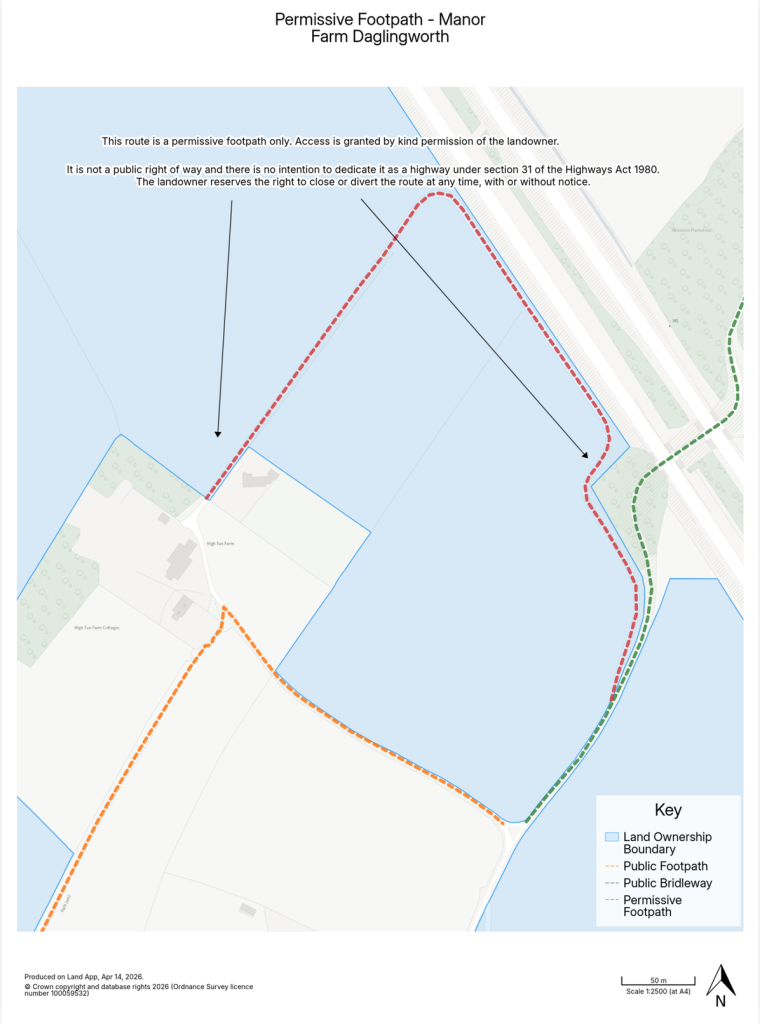 This route is a permissive footpath only. Access is granted by kind permission of the landowner. It is not a public right of way and there is no intention to dedicate it as a highway. Under section 31 of the highways act 1980, the landowner reserves the right to close or divert the route at any time, with or without notice.